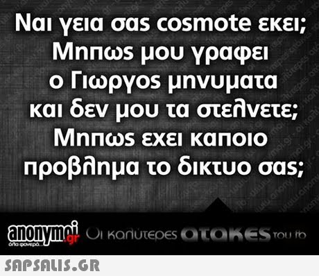 Cosmote.gr, φτιαγμένο σύμφωνα με τις ανάγκες σου. Κάτι πρέπει να γίνει επιτέλους με το πρόβλημα που υπάρχει στη σύνδεση internet on the go στην περιοχή σούδας κρήτης. Βλέπουμε να υπάρχουν σήμερα εδώ και λίγες ώρες πολλές αναφορές για προβλήματα πρόσβασης στο δίκτυο της cosmote μέσω mobile data (smartphones). Από cromdimitris στο φόρουμ κινητή ευρυζωνικότητα. Κάτοχος s8 με όλα τα τελευταία updates σε συσκευή και apps, με συμβόλαιο cosmote, σταμάτησα ξαφνικά να λαμβάνω sms από τη μια μέρα στην άλλη χωρίς να πειράξω τίποτα.